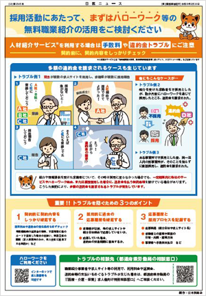 日本医師会では、有料職業紹介事業等の利用に関して、手数料や違約金をめぐる思わぬトラブルを防ぐため、ポイントをまとめたリーフレットを作成しました。 近年、複数の求人サイトから手数料・違約金を請求されるケースや、ハローワーク経由で採用した場合にも請求を受ける事例が発生しています。 トラブルを防ぐために、事前に必ずご一読ください。また、厚生労働省でも同様にリーフレットを作成していますので、併せてご参照ください。