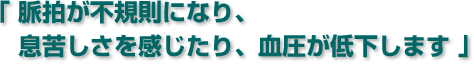 不整脈とは、この電気刺激が正常に働かなくなり、脈が不規則になってしまう状態のことで、動悸や息苦しさを感じ、ひどくなると血圧が低下し、失神やショックを起こすこともあります。 |