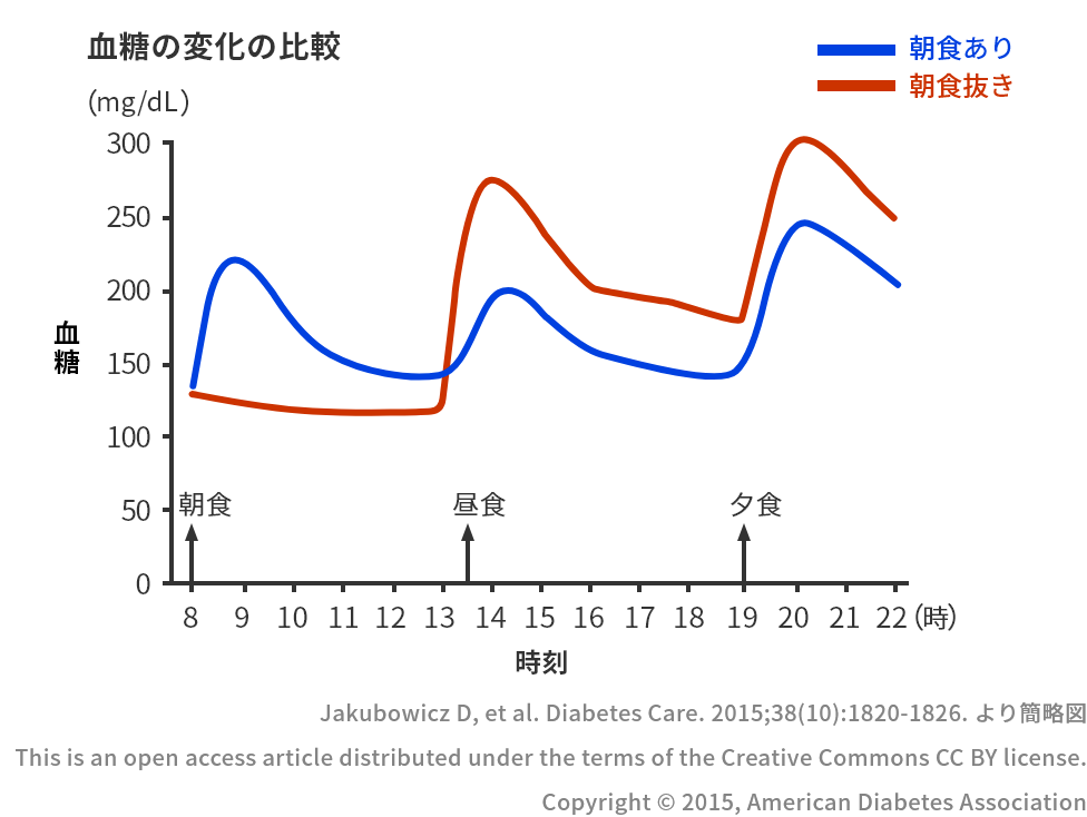 ●食事のとりかたにも気を配る 食事療法では何を食べるかはもちろん重要ですが、同様に食事のとりかたも考慮することが大切です。 たとえば、朝食を抜いた場合、昼食後と夕食後に血糖値が急激に上がりやすくなります1)。下図のように、糖尿病の人が朝食をとらなかった場合には、昼食後、夕食後ともに血糖値が急激に上昇してしまいます。 また、朝食抜きのほうが1日2食となり総摂取カロリーは低いにもかかわらず、血糖値上昇を比較する指標であるグラフの曲線より下の面積(血糖値上昇曲線下面積)は、朝食抜きのほうが大きくなってしまっていることがわかります。 ![]() ただし、1日3食をとっていたとしても、夕食の時間が遅いと、夕食後に血糖値が急激に上昇してしまいます。逆に、夕食を早い時間帯にとると、食後の血糖値が急激に上昇しにくくなります。早い時間帯にしっかり夕食をとるのが難しい場合は、早い時間帯に一部を食べ、残りを遅い時間帯に食べると、食後の急激な血糖値の上昇が抑えられます2)。 また、野菜を主食(炭水化物)よりも先に摂取すると、食後の血糖値が急激に上昇しにくくなることもわかっています3)。食べる順番にも気をつけるとよいでしょう。