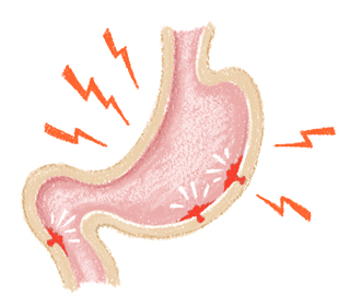 軽いものは内面の粘膜に傷ができた状態で、びらん(ただれ)といいますが、ひどくなると内壁深くまで潰瘍が達し、時には胃壁に穴があくこともあります。