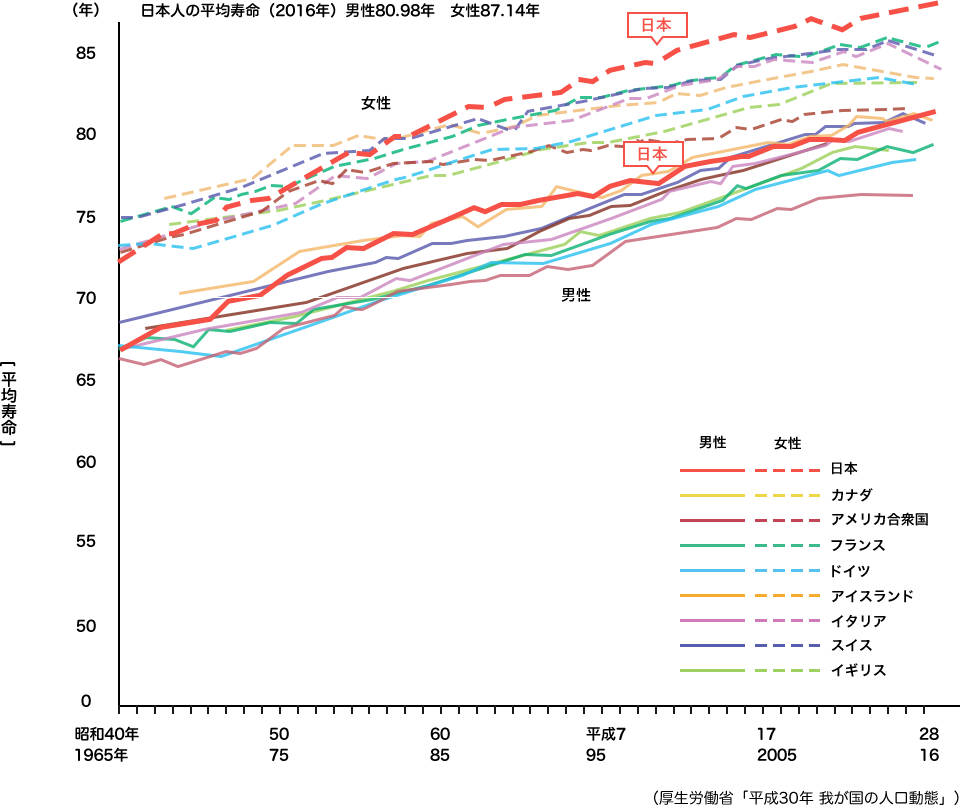 日本では公的医療保険などの優れた制度や仕組みによって、国民皆保険が実現する直前の1960年に女性が約70歳、男性が約65歳であった日本人の平均寿命は、大幅に伸び、55年以上経った2017年には女性が87.25歳、男性が81.09歳になりました(図2-1で示した2016年でも女性は87.14歳、男性は80.98歳になっている)。