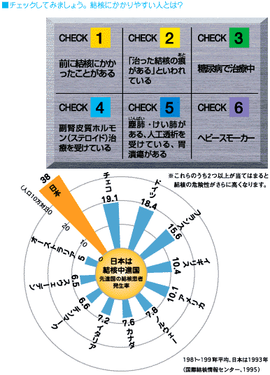 | かつては「亡国病」と恐れられた結核も、医療や生活水準の向上のおかげでずいぶん少なくなりました。しかし、それでも日本ではいまなお、毎年4万5千人の患者が新たに発生し、3千2百人もがこの病気で命を落としているのです。欧米の先進国と比べると、日本はまだ20年〜30年も遅れた「結核高蔓延国」なのです。 | ||