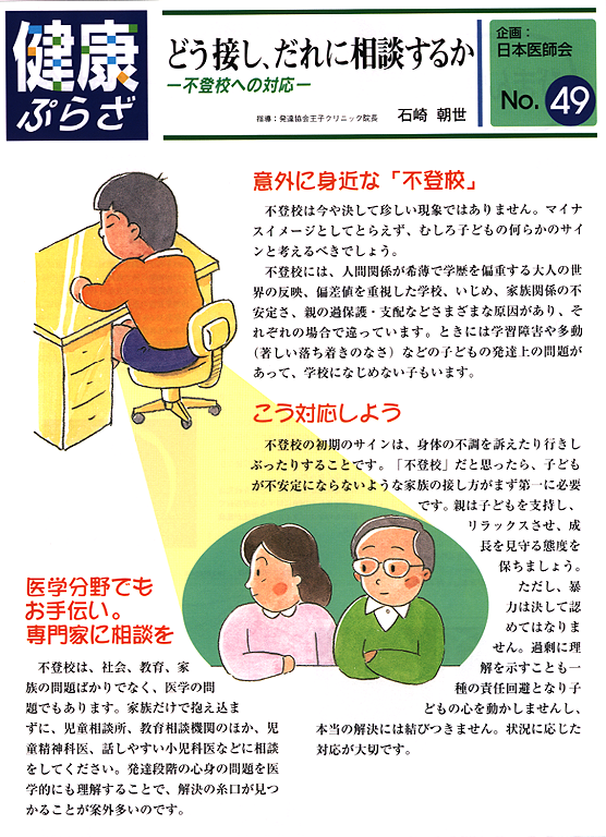 | 不登校は、社会、教育、家族の問題ばかりでなく、医学の問題でもあります。家族だけで抱え込まずに、児童相談所、教育相談機関のほか、児童精神科医、話しやすい小児科医などに相談をしてください。発達段階の心身の問題を医学的にも理解することで、解決の糸口が見つかることが案外多いのです。 |